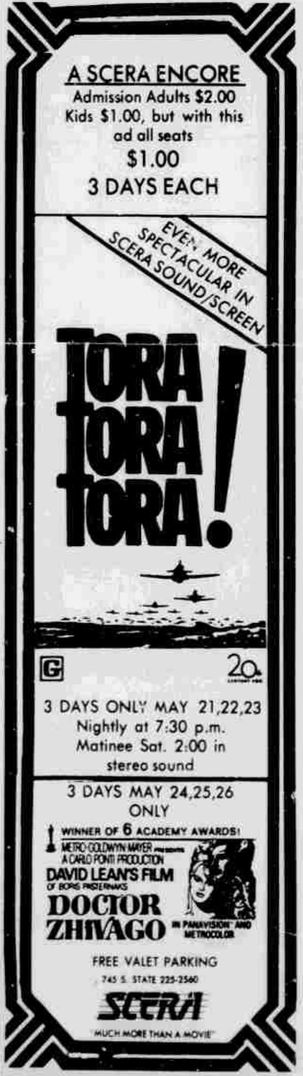 A SCERA encore presentation of Tora, Tora, Tora! in "stereo sound."  The ad includes a banner, "Even More Spectacular in SCERA Sound/Screen."  The next film in the series is Doctor Zhivago.