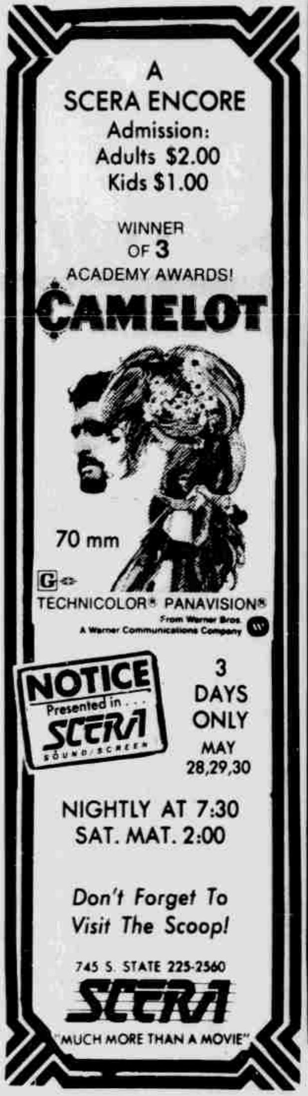Ad for a 3-day only presentation of Camelot in 70mm at the SCERA Showhouse. - , Utah