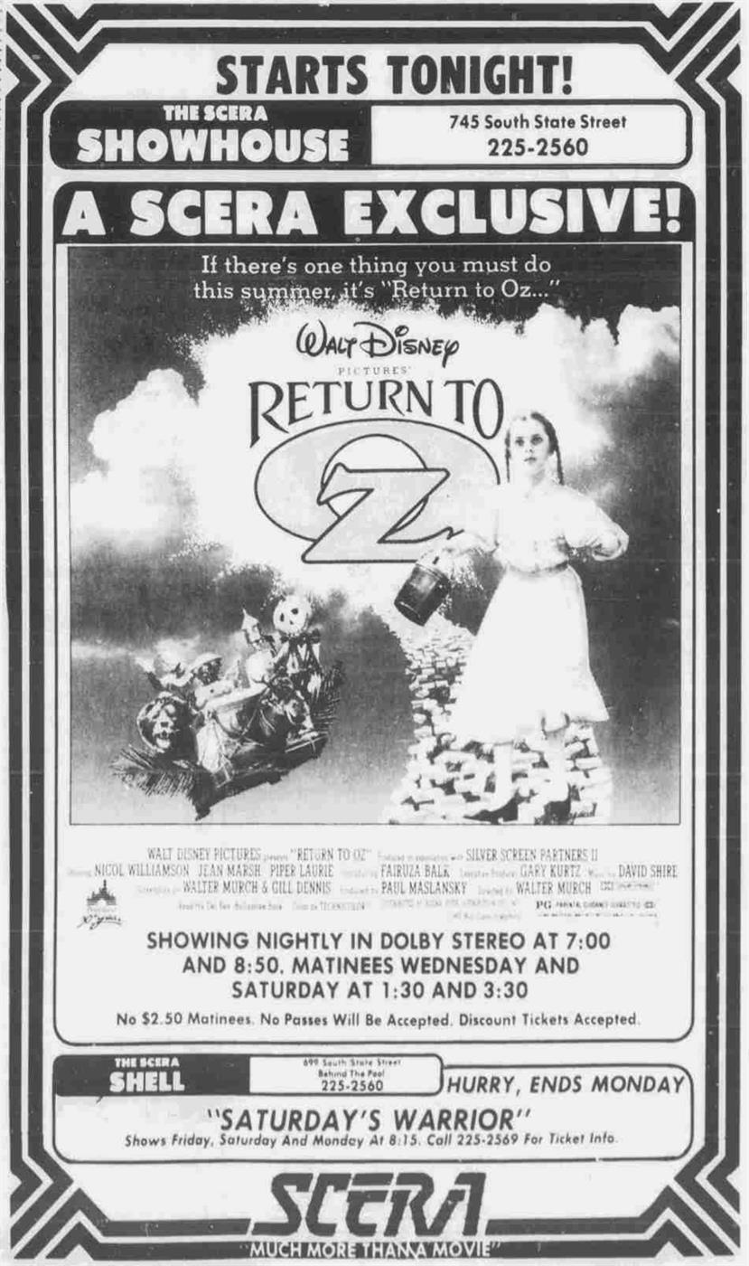 Opening night advertisement for the film 'Return to Oz' at the SCERA Showhouse. - , Utah
