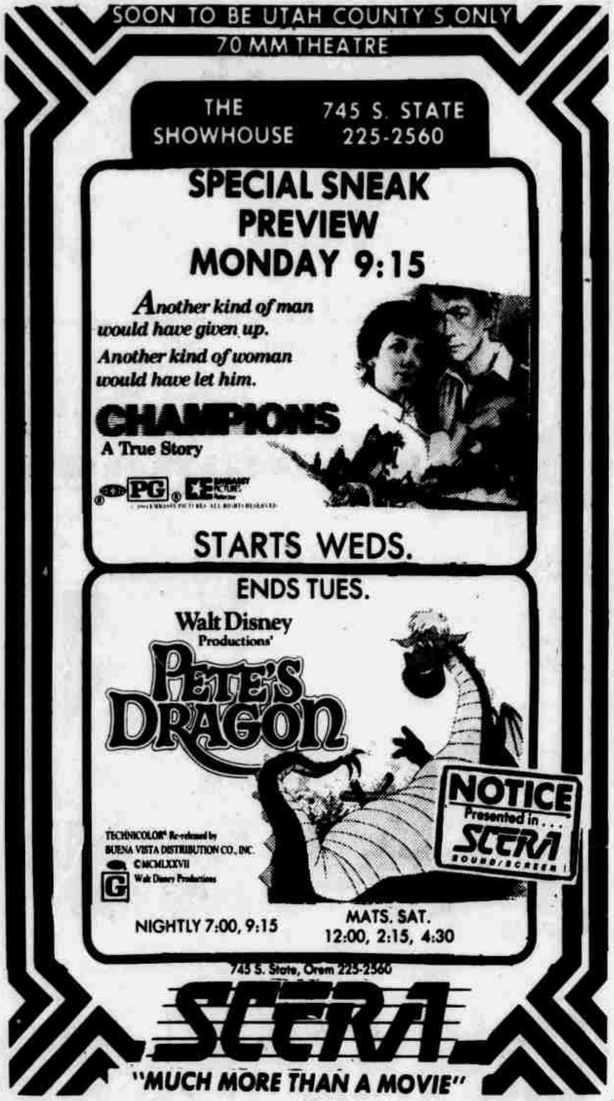 At the top of an advertisement for Champions and Pete's Dragon, the SCERA Showhouse announces it is  "Soon To Be Utah County's Only 70MM Theatre."