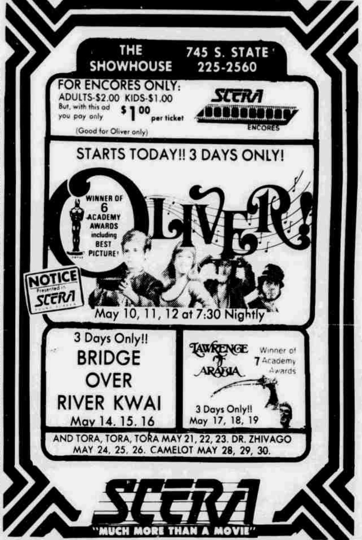 A 'Starts Today!!' advertisement for Oliver! at the SCERA Showhouse.  Other films in the series are listed with their dates. - , Utah