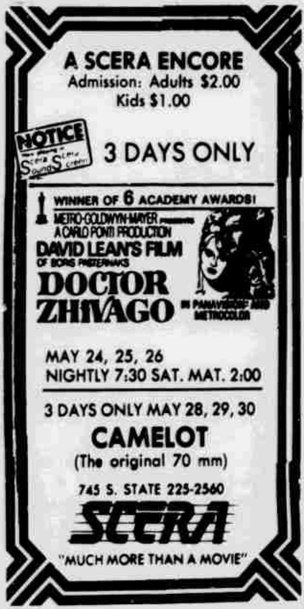 An ad for Doctor Zhivago at SCERA includes the dates for Camelot, "The original 70 mm".