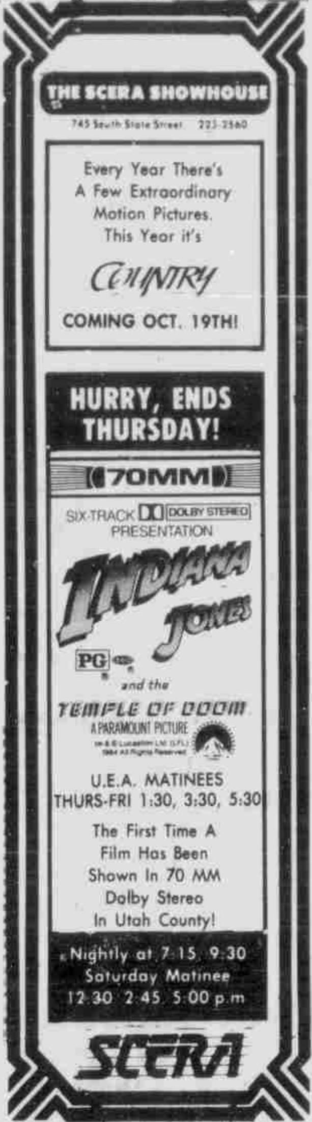 SCERA showed Indiana Jones and the Temple of Doom in 70MM Six-Track Dolby Stereo for one week, starting 5 October 1984.  "Finally!  The first time a film has ever been shown in 70MM Dolby Stereo in Utah County!"