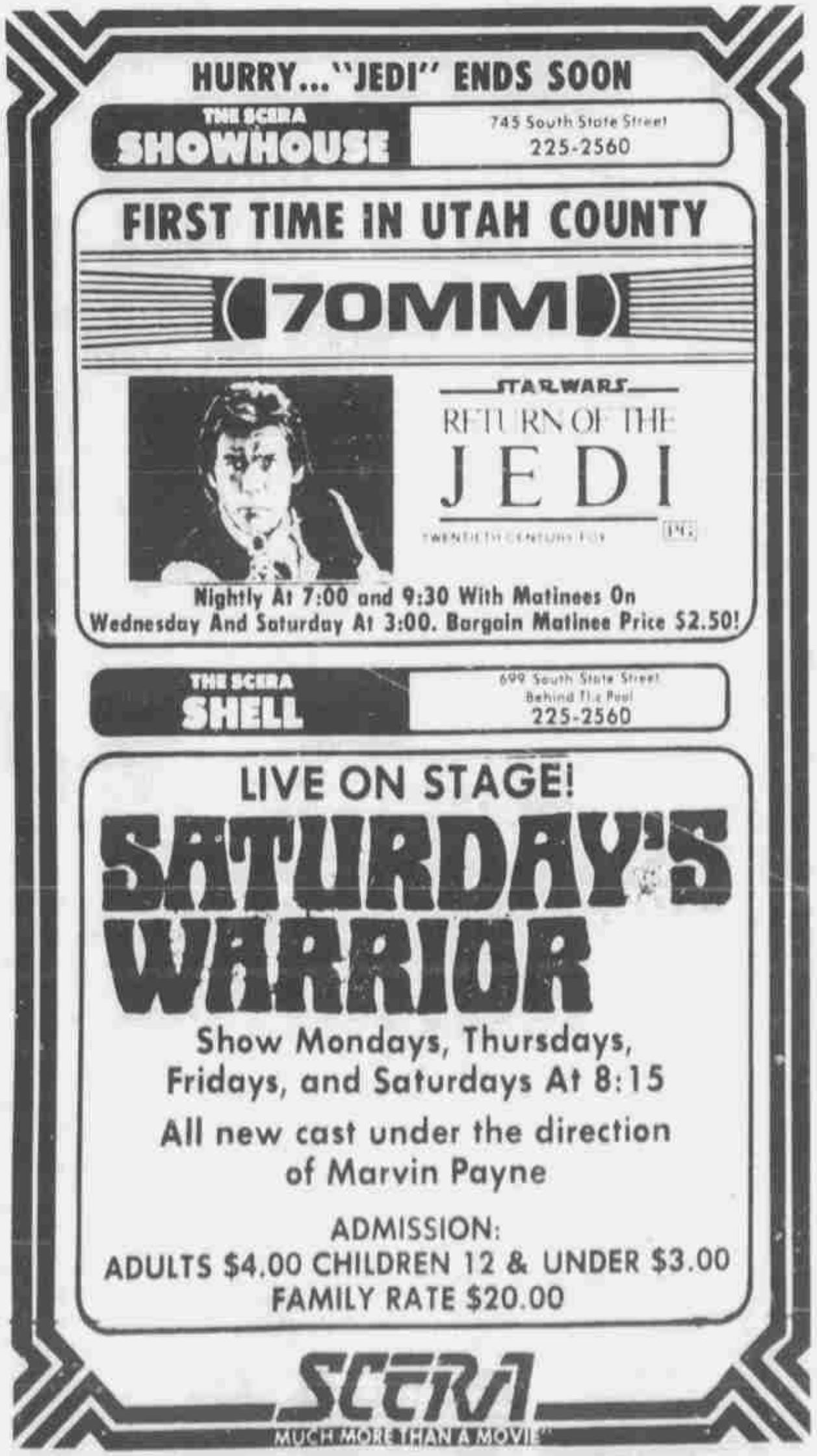 "Hurry... 'Jedi' Ends Soon" ad for Return of the Jedi at SCERA Showhouse, "First Time in Utah County 70MM."  Saturday's Warrior was "Live On Stage!" at the SCERA Shell.
