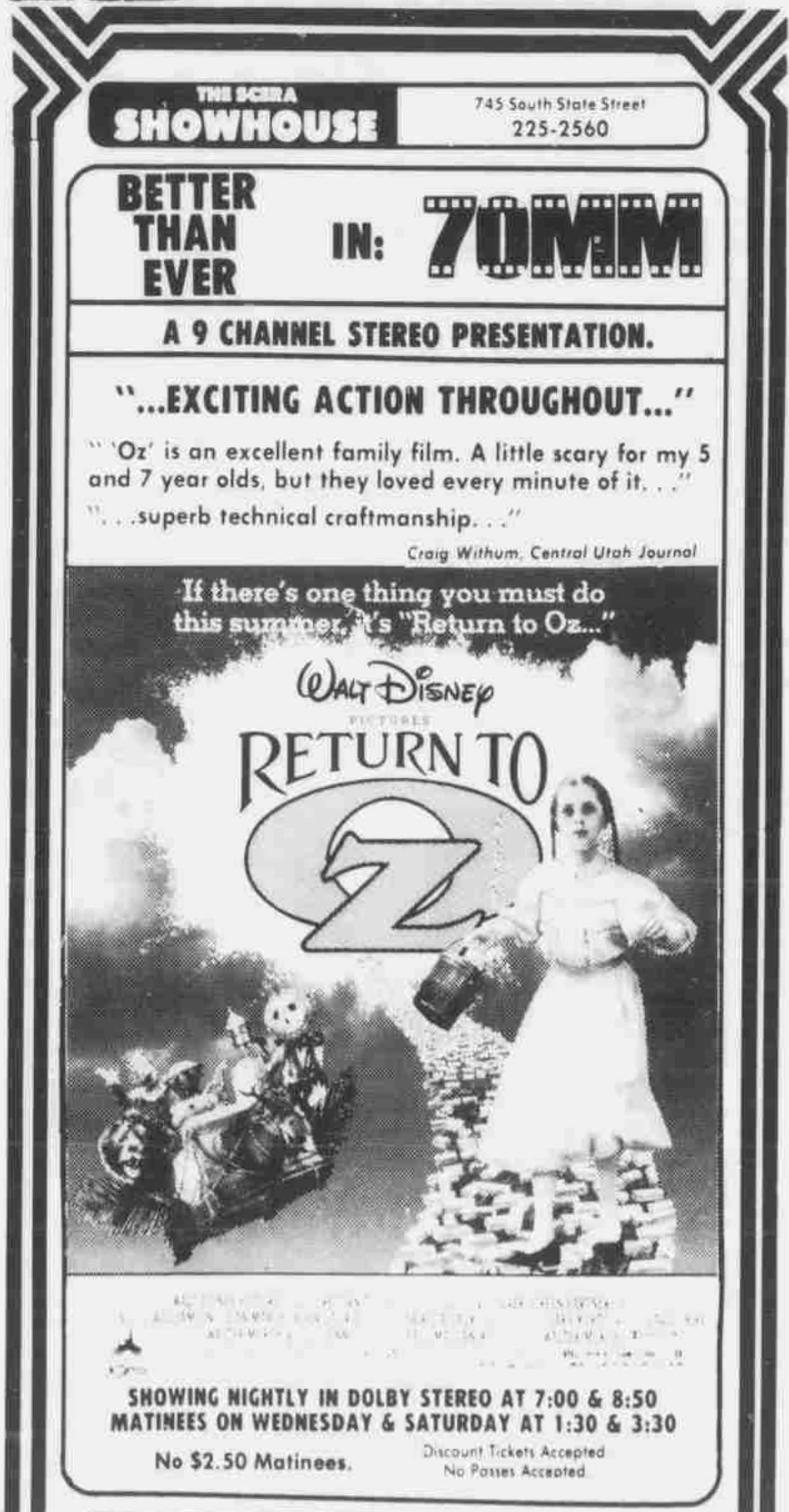 Advertisement for 'Return to Oz' at the SCERA Showhouse, presented in 70MM 9-Channel Stereo. - , Utah