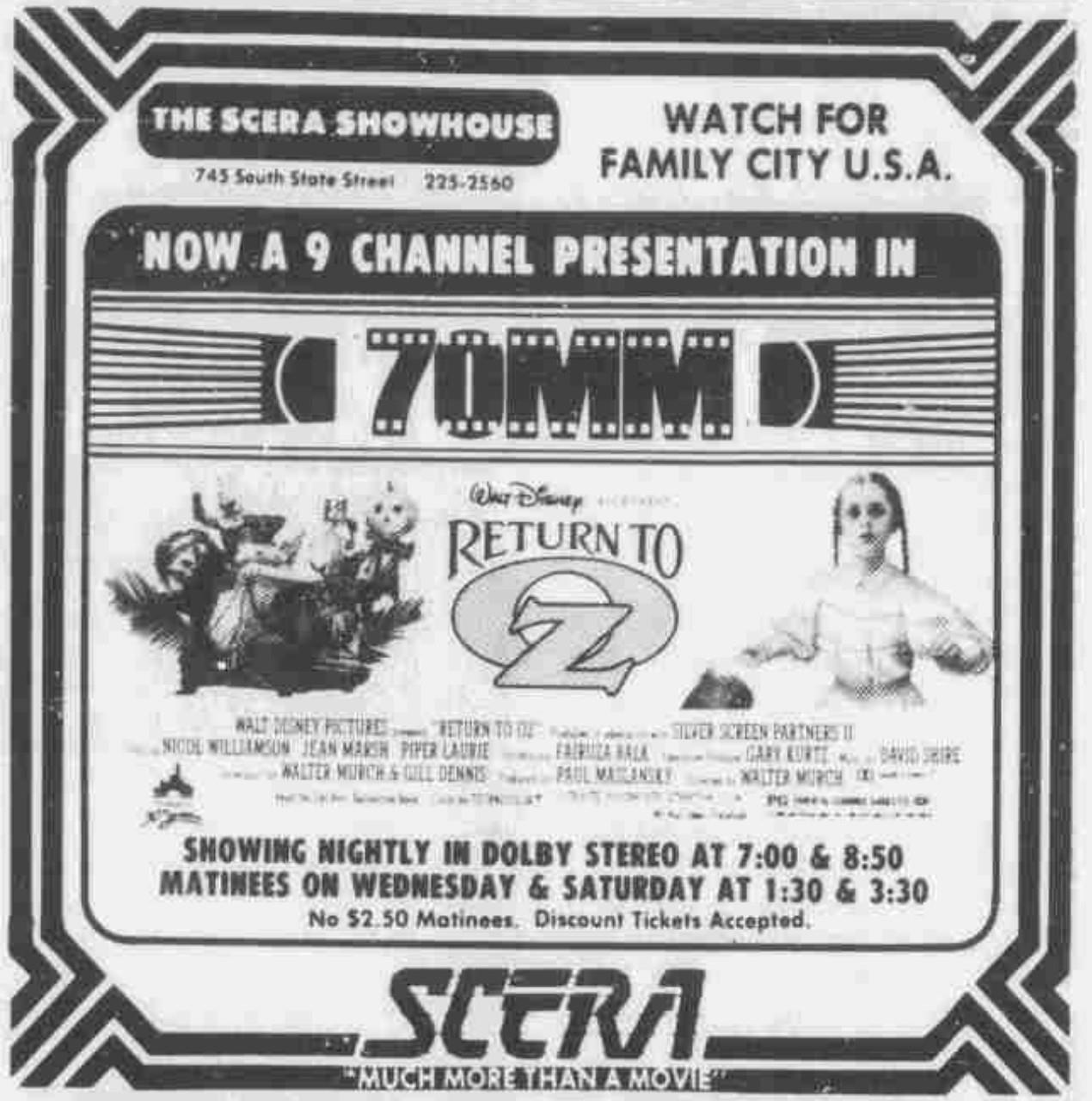 On its fourth week, SCERA Showhouse started advertizing Return to Oz as "Better Than Ever, in 70mm, a 9 Channel Stereo Presentation."