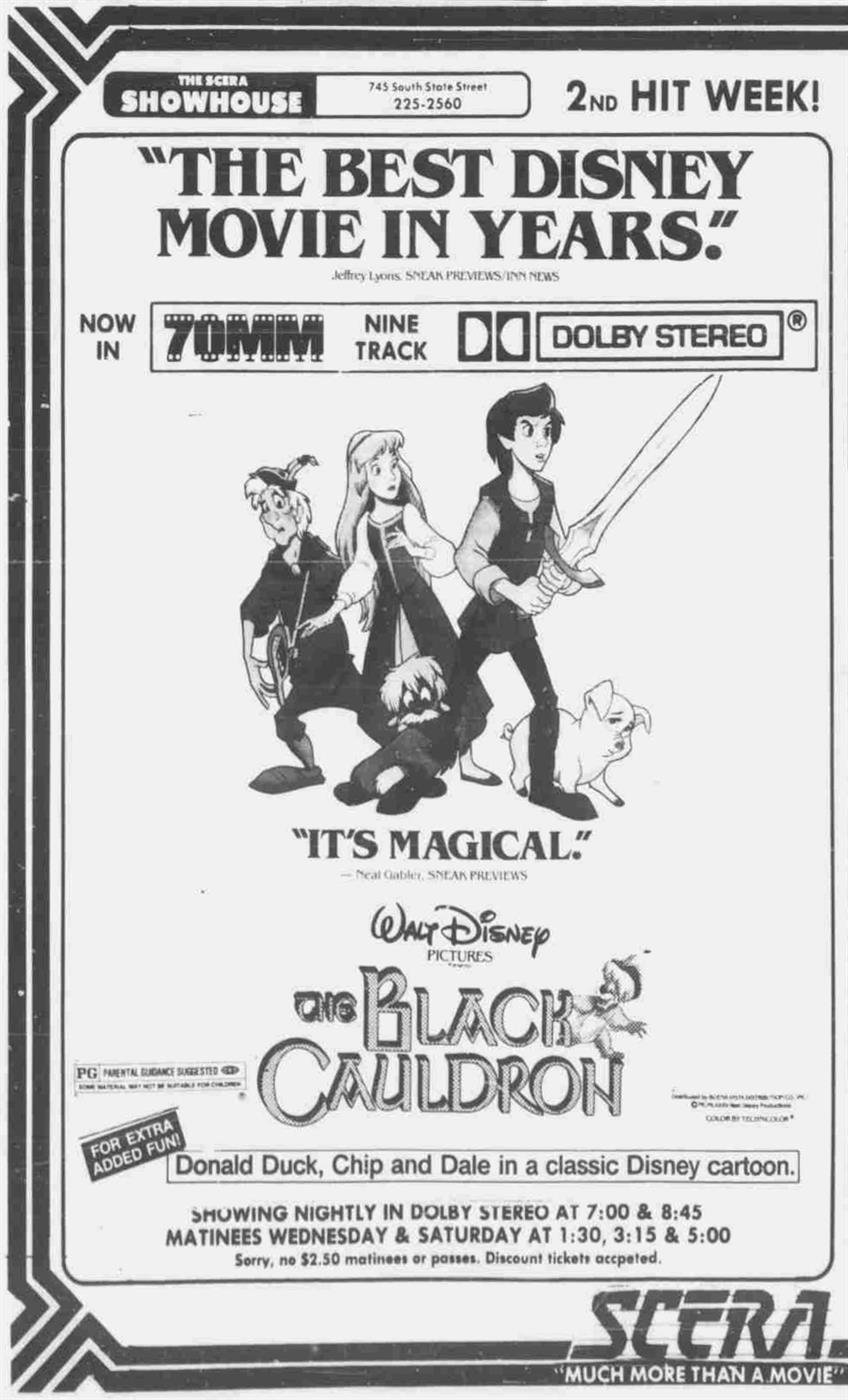 SCERA advertised "Hurry... Ends Soon!" forThe Black Cauldron, on 6 September 1985, still in 70mm 9 Track Dolby Stereo.