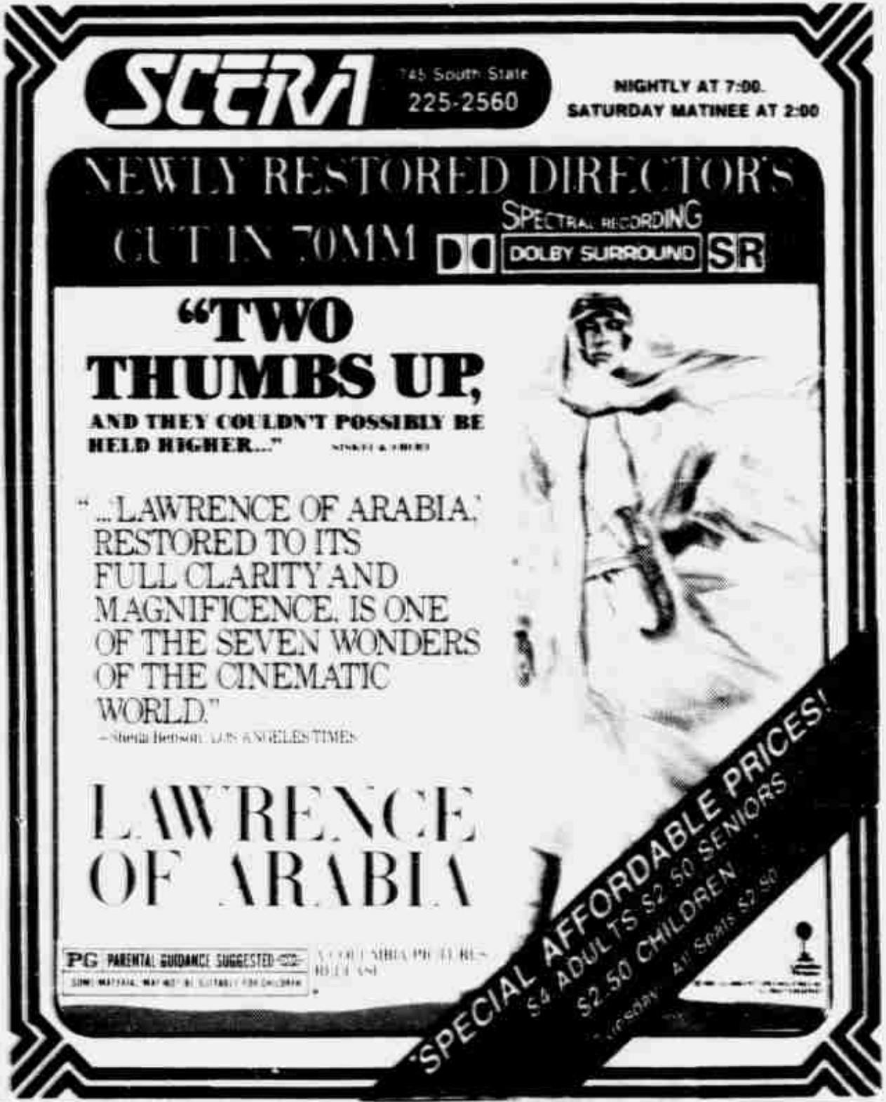 Opening day ad for the "Newly Restored Director's Cut" of Lawrence of Arabia, presented in 70mm Dolby Stereo SR.  "Speciual Affordable Prices!"
