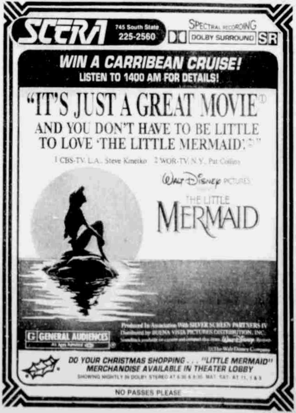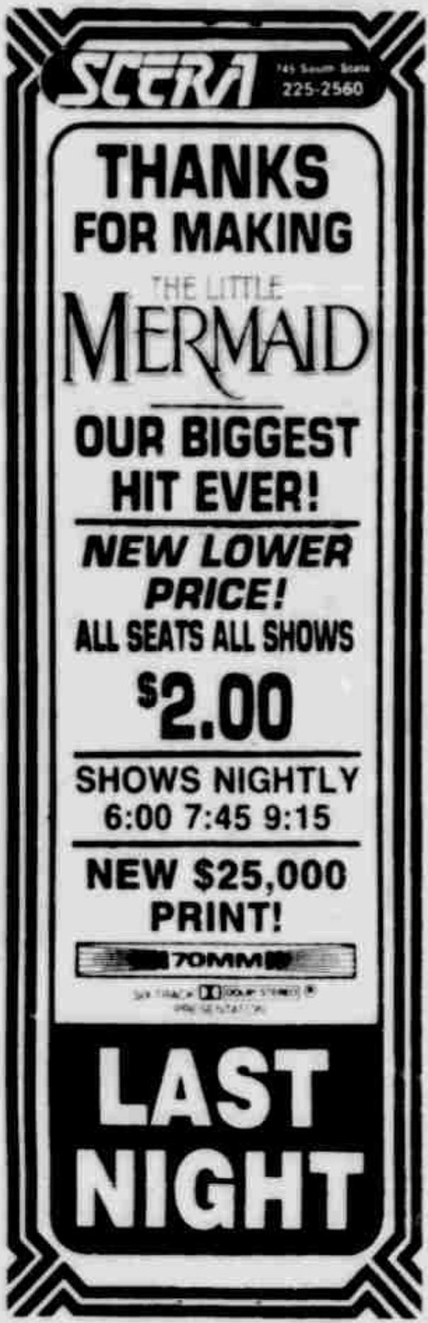 The Ten Commandments ended its run at SCERA on 22 March 1990, while The Little Mermaid continued alone, in 70mm, with a "New $25,000 Print!"
