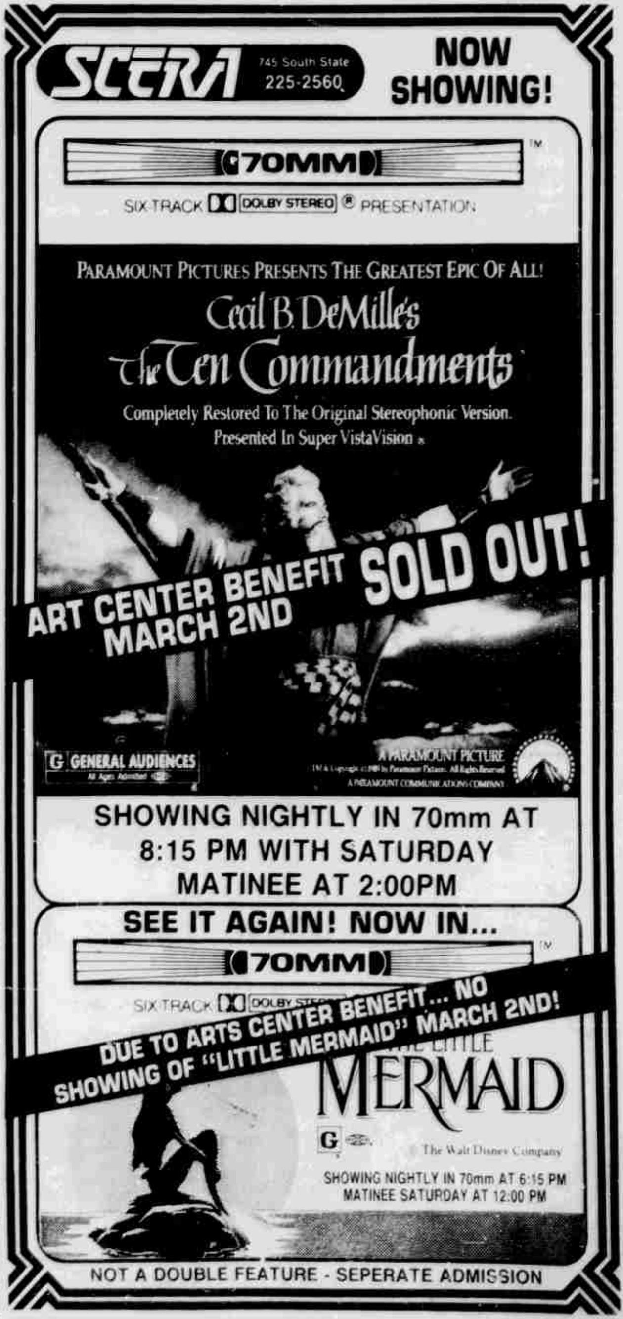 Advertisement for 'The Ten Commandments' and 'The Little Mermaid', both in 70mm at the SCERA Showhouse.  The benefit for 'The Ten Commandments' sold out. - , Utah