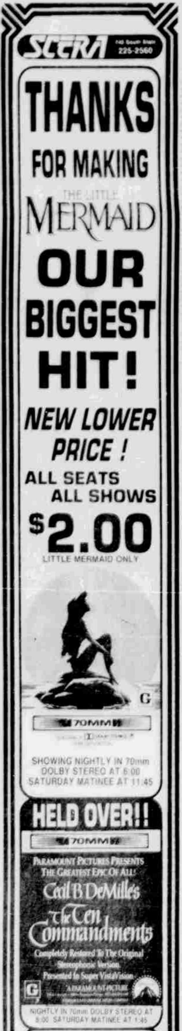 The Ten Commandments was held over for a third week, with its run ending on March 22.  The Little Mermaid continued in 70mm, with a "new lower price" of $2.00.  "Thanks for making The Little Mermaid our biggest hit!  New Lower Price!  All seats, all shows $2.00."
