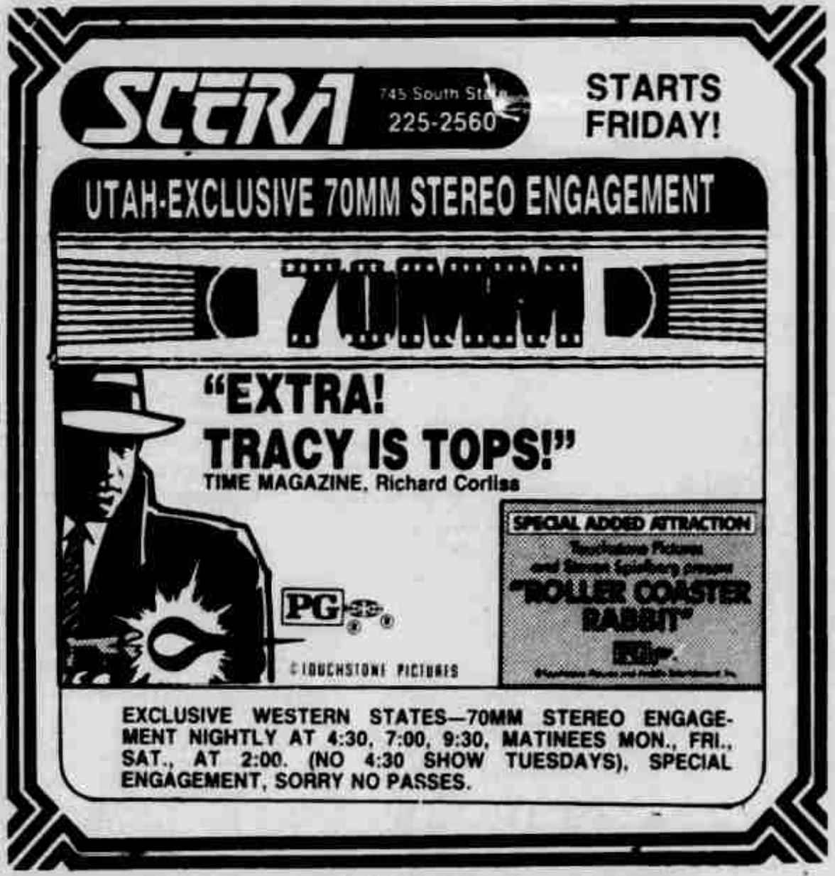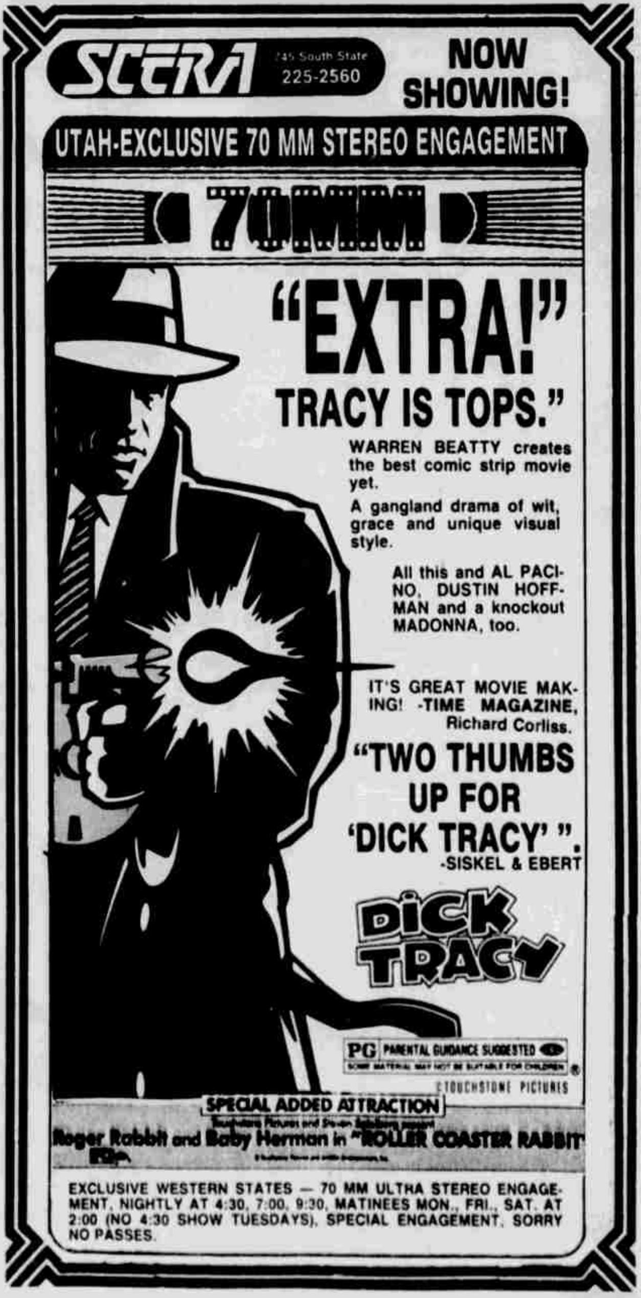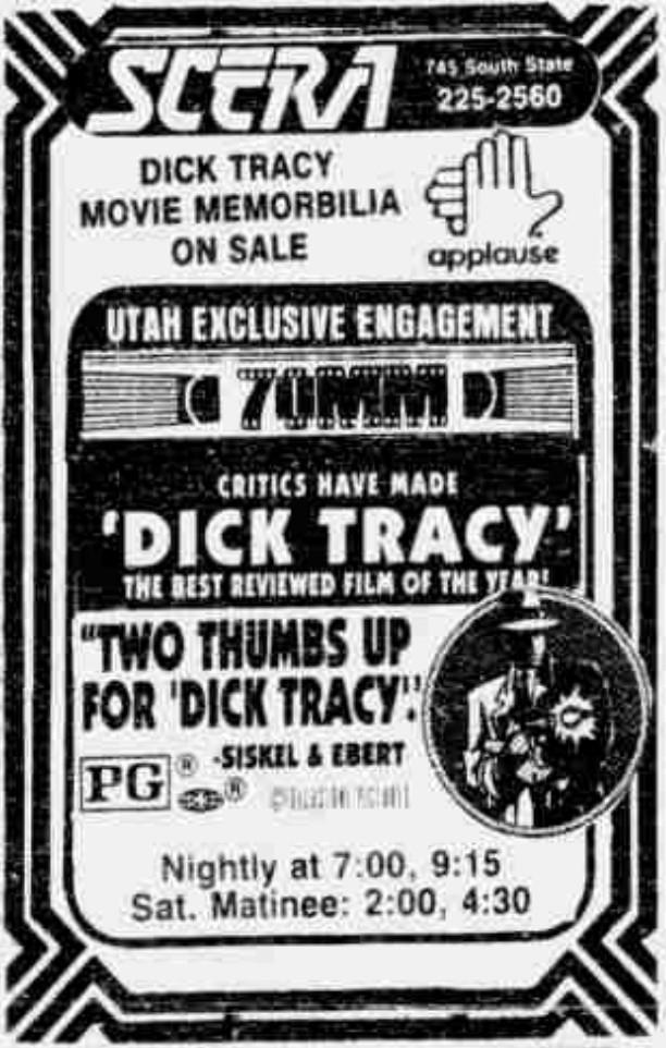 Advertisement for 'Dick Tracy' at SCERA.  'Exclusive Western States -70MM Stereo Engagement.' - , Utah